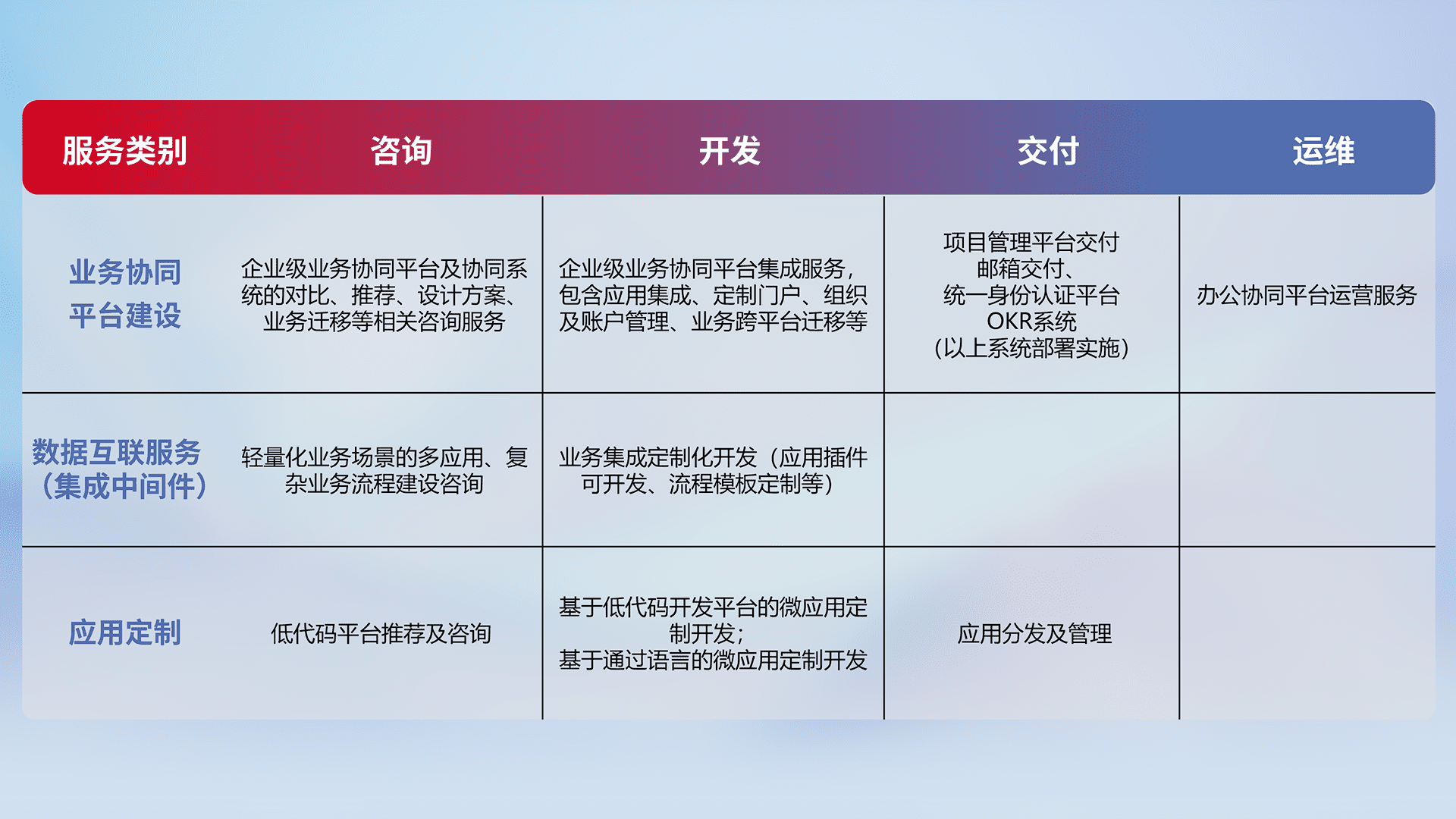 针对钉钉、、、企微、、IDaas等平台级产品提供产品的规划、、、、方案、、、、交付、、、定制化开发等服务,,,实现如统一协同办公、、、智能客户服务、、、、混合会议管理、、、智能数据查询、、、等业务场景,,实现数字化转型。。