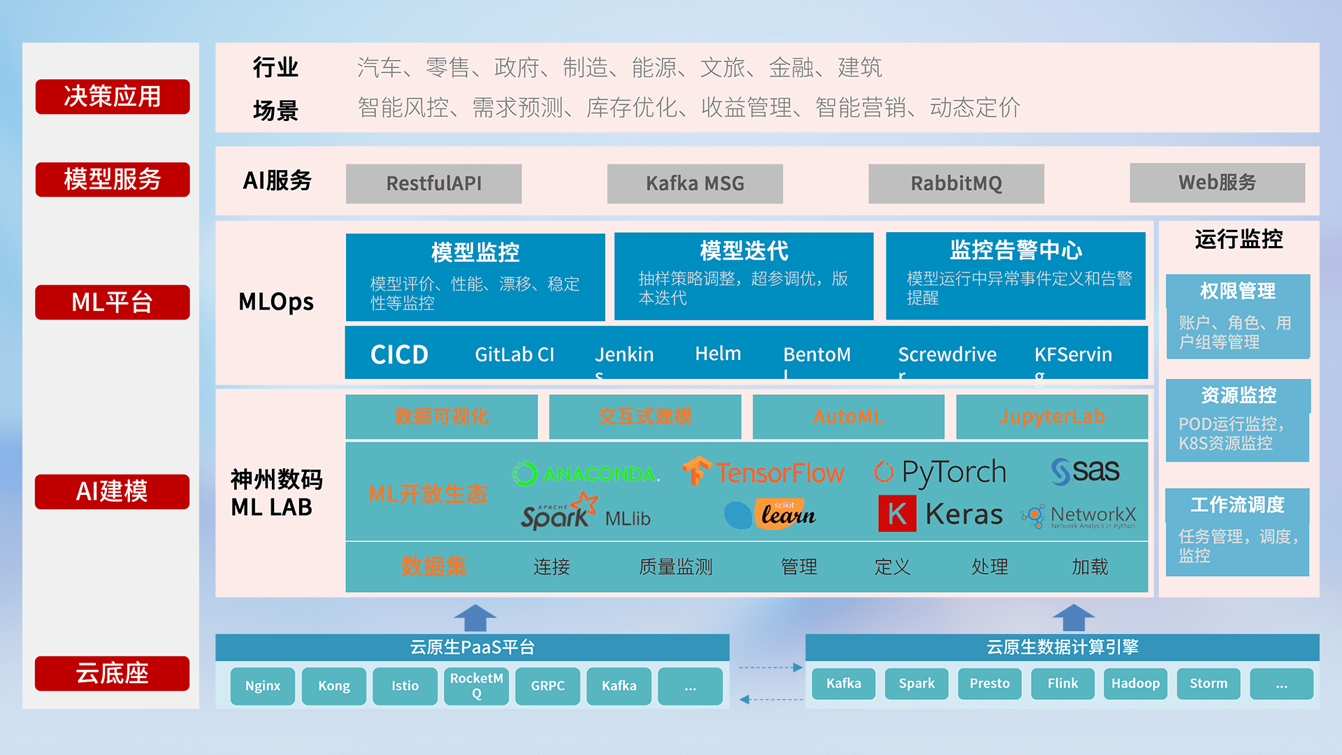 数据+模型双引擎驱动,,面向智能服务场景,,快速灵活利用AI技术,,支持业务决策,,,,助力企业智能化转型破局。。